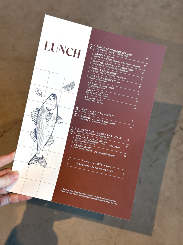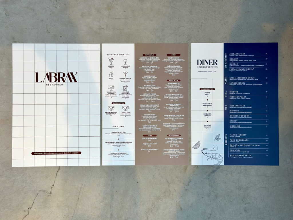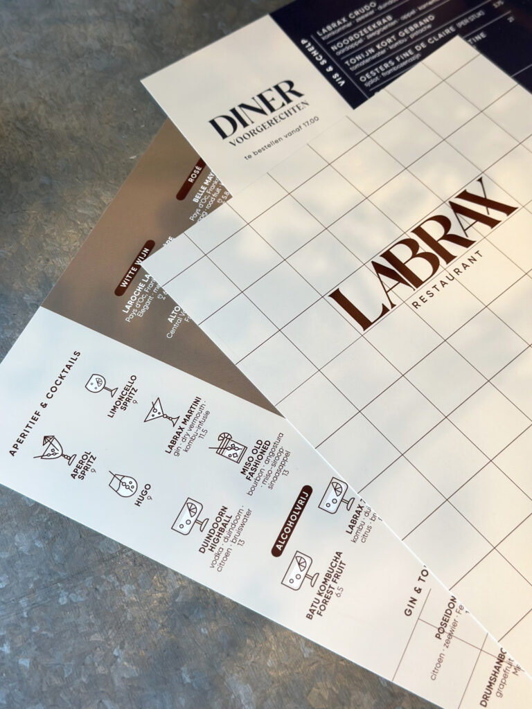 Voor Labrax te Oostkapelle mochten wij het logo, de gevelreclame maar óók het drukwerk van de menukaarten verzorgen. We hebben hierbij gekozen voor een handzaam A4 foramaat op synaps 300 grams waterafstotend papier. Zeer geschikt voor in de horeca want dit kan tegen een stootje.