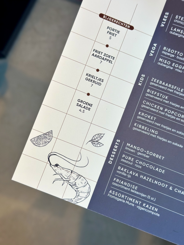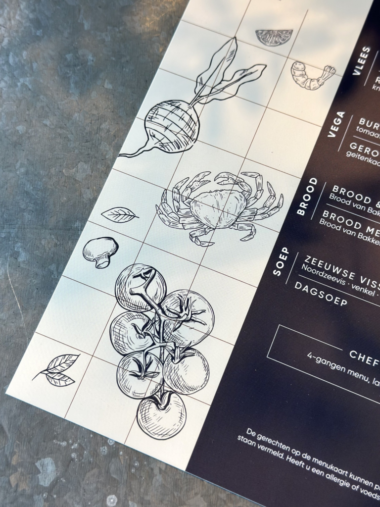 Natuurlijk is de huisstijl helemaal doorgetrokken in de kaart, dat nodigt uit om te eten vindt je niet? Enjoy!