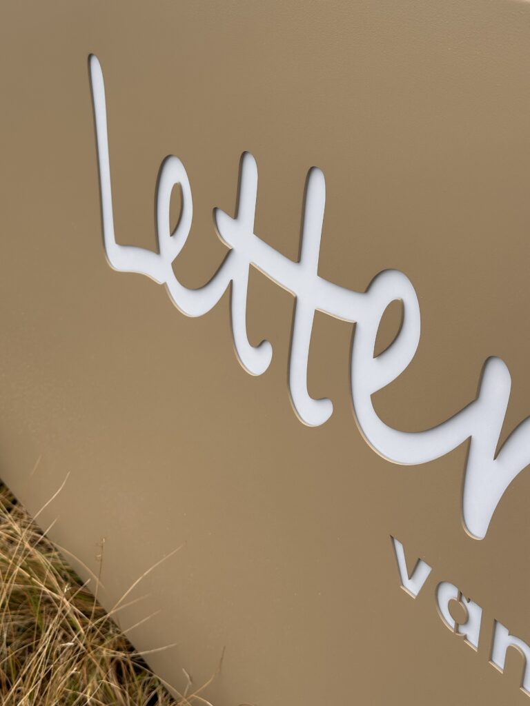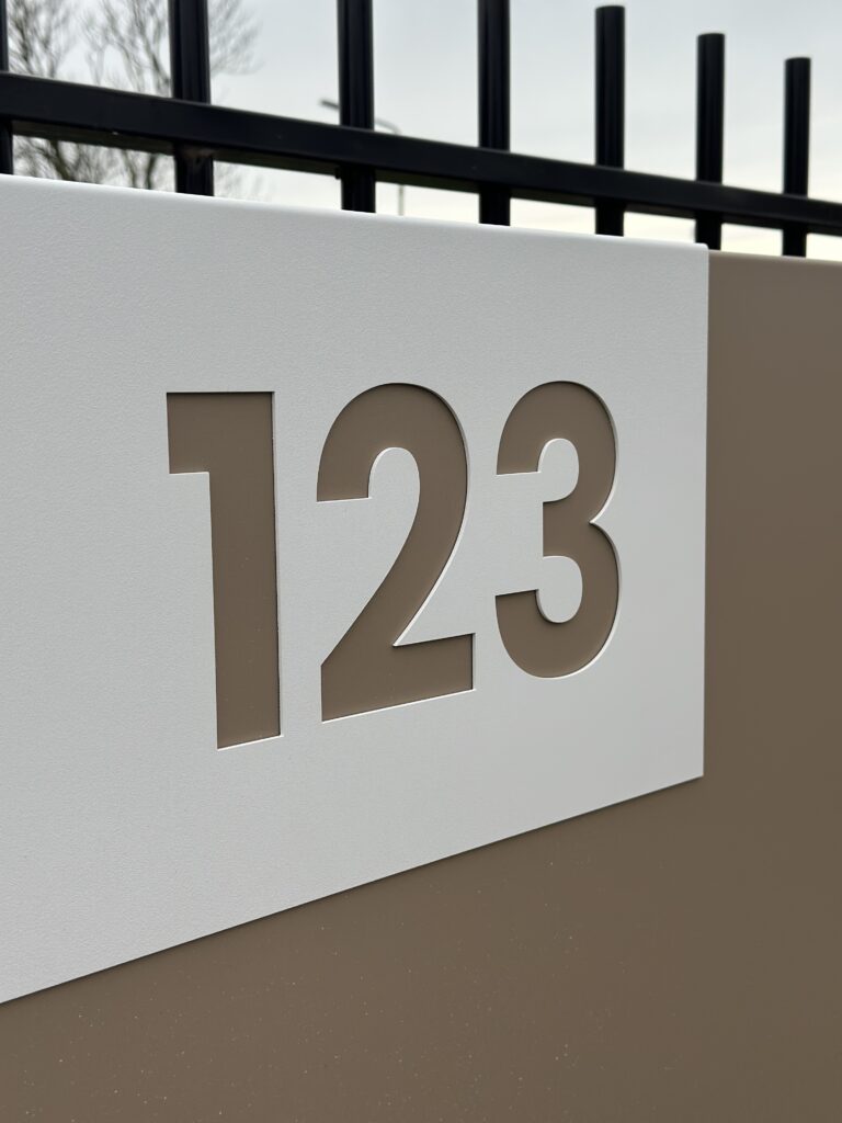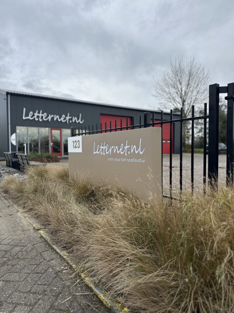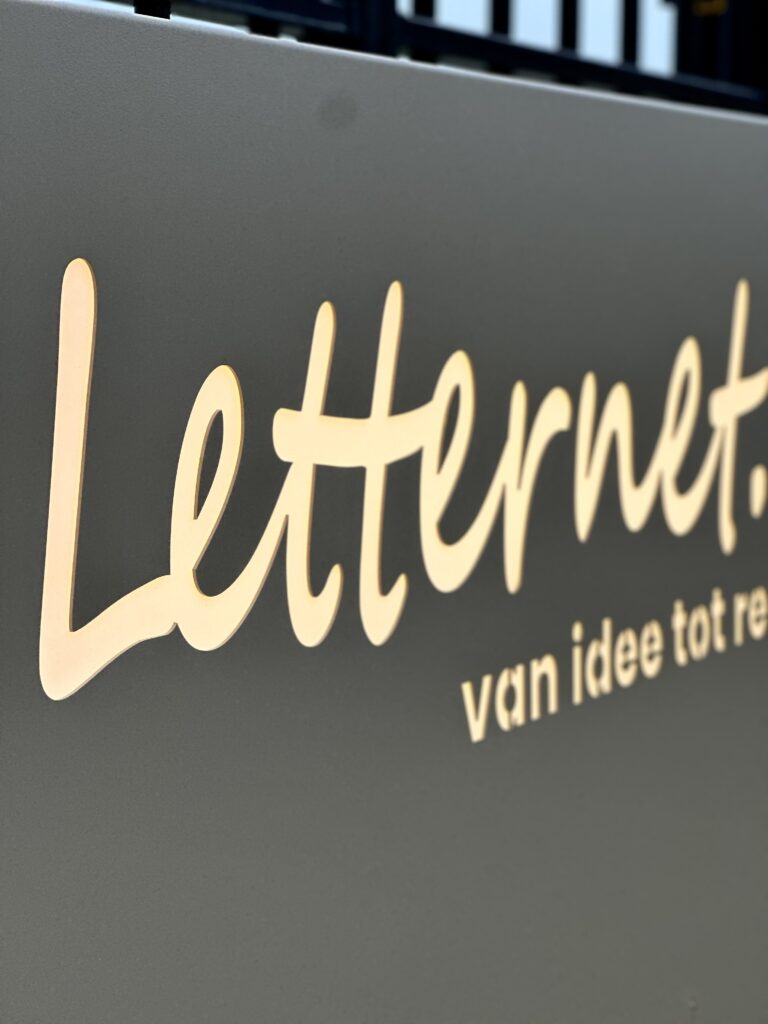 Onze aluminium reclame. Wij hebben gekozen voor een gepoedercoate laag wat zorgt voor een fijne structuur op de plaat. Met uitgestanste letters in het aluminium, opgevuld met een opaal plaat voor de ledverlichting. Om het 3D beeld nog wat meer te versterken kozen wij voor een extra plaat met een uitgestanst huisnummer.